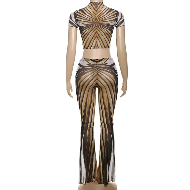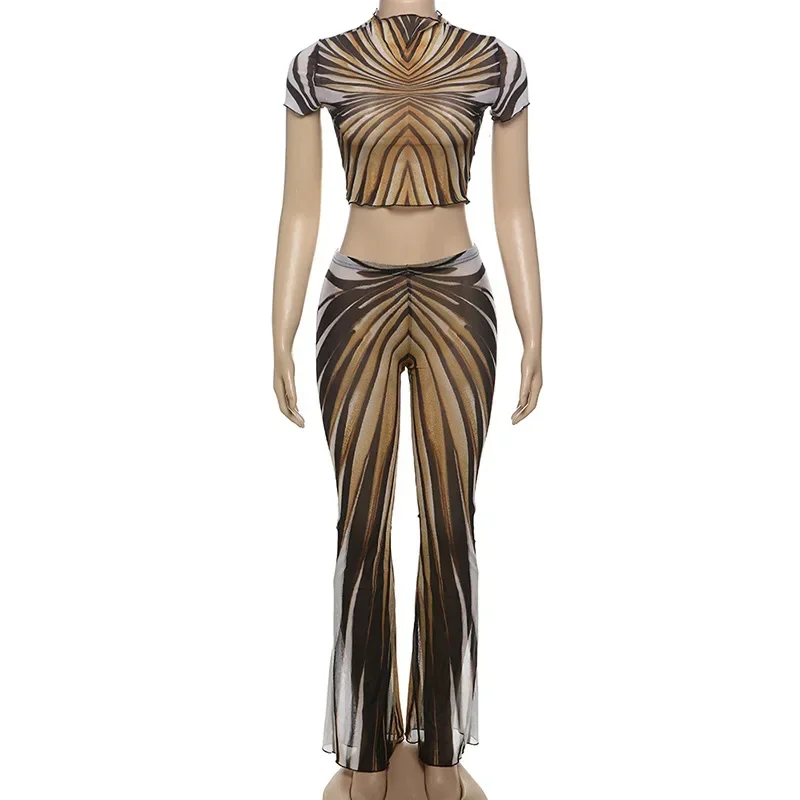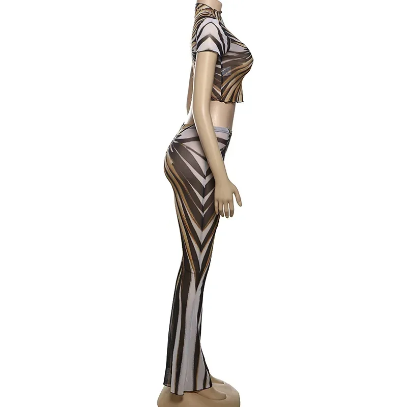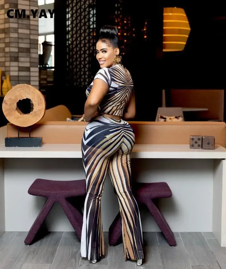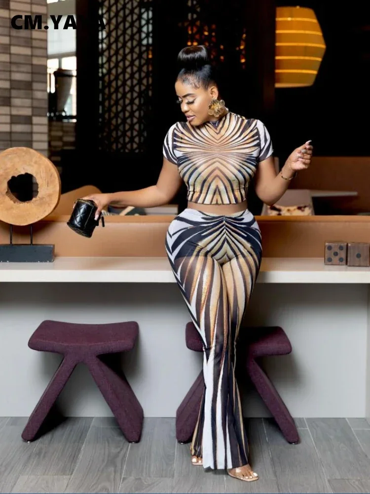 CM.YAYA 2025 Spring Streetwear Women’s Set Mesh Striped Print Short Sleeve T-shirt +Long Pants Tracksuits Two 2-Piece Set Outfit