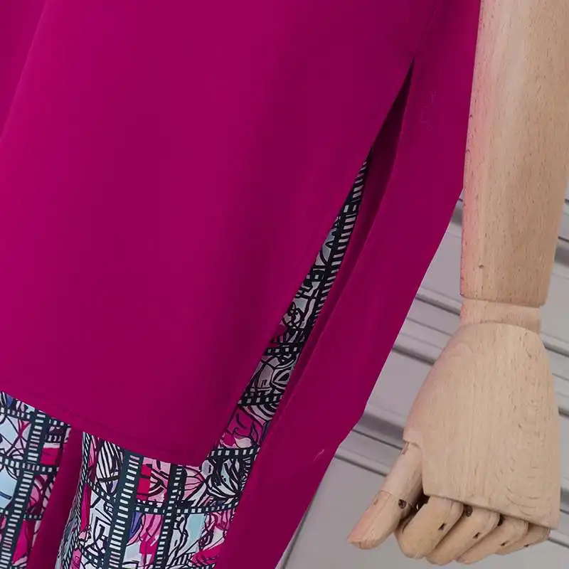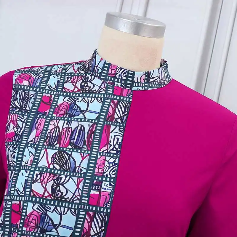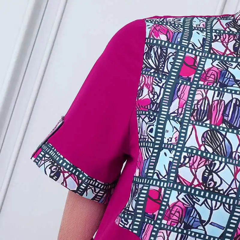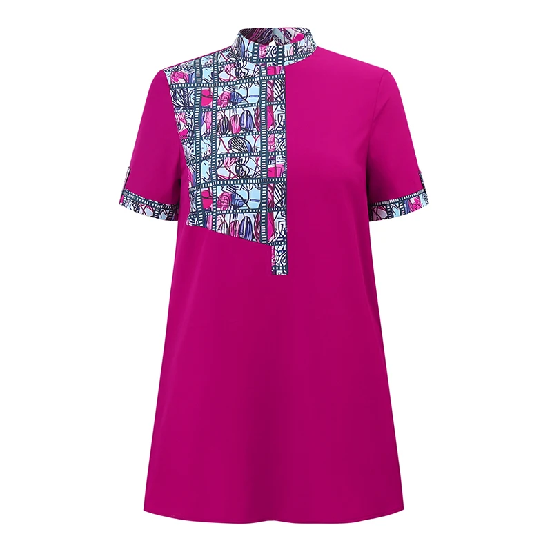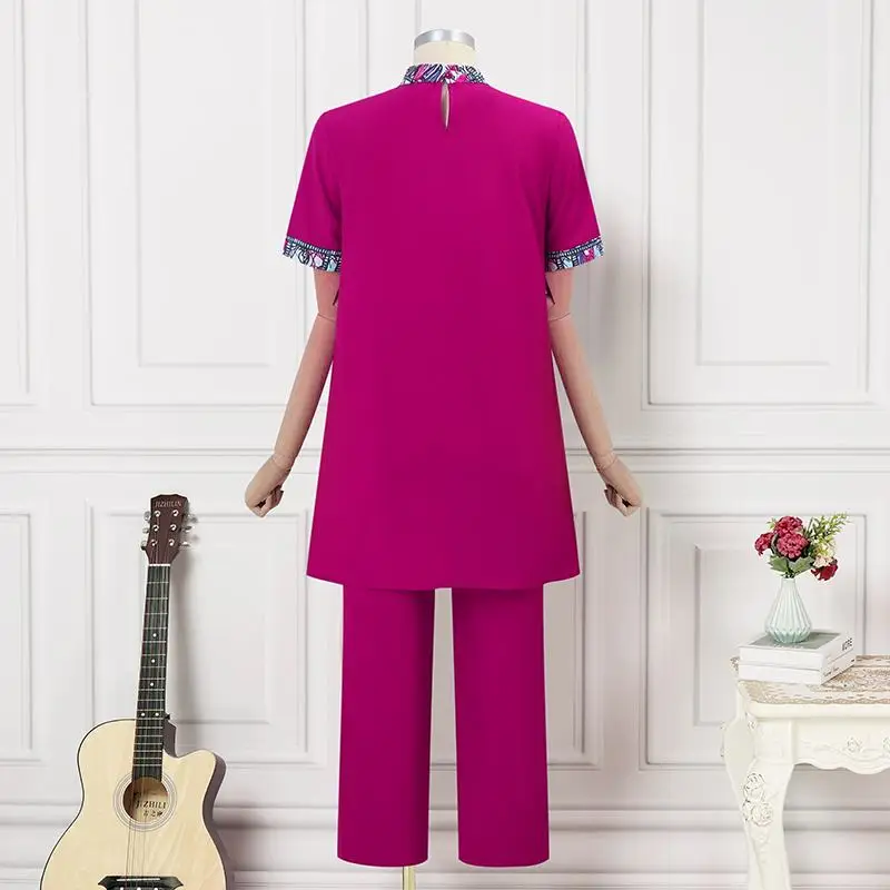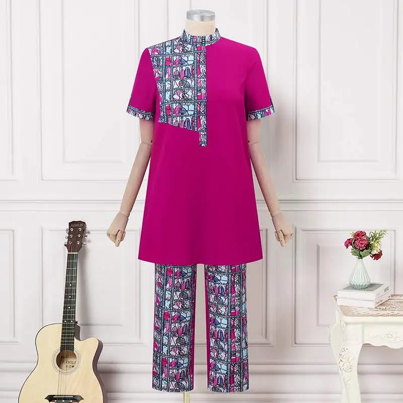 Features:Stand up collar, short sleeved, printed, top+pants, set