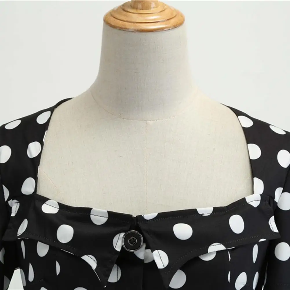 Vintage 1950s Style: Embrace classic elegance with this retro dot dress, featuring a square collar and lace-up details for a timeless look.