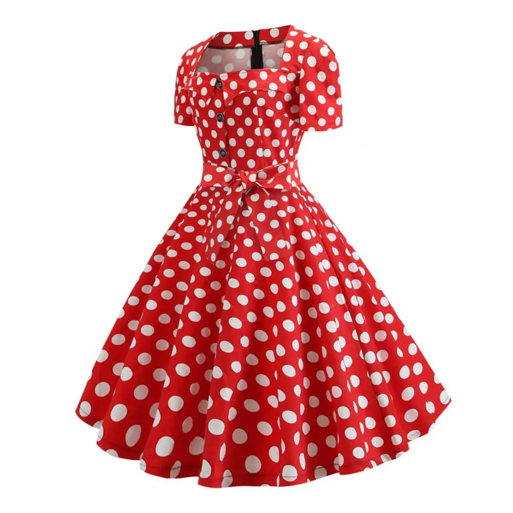 Women Dress Square Neck Short Sleeve Retro 1950s A-line Big Hem Button Decor Dot Print Color Matching Mid Waist Belted Bow Decor Performance Prom Midi Dress